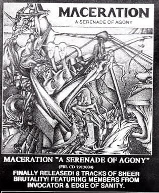 Maceration was a project of two Invocator members (Jakob Schultz and Jacob Hansen), and Rune Hansen and Lars Bangsholt. The band formed in January 1990. On their debut "A Serenade of Agony" Dan Swanö did the vocals using his famous pseudonym Day Disyraah. Jacob Hansen left the band after the CD was released, and then Maceration started changing music style towards groove and hardcore. Maceration made one more demo tape in 1995 playing that style, before they split up. Some members continued playing together in the hardcore band Self, that made one CD "The Sinister Urge" in 1998.